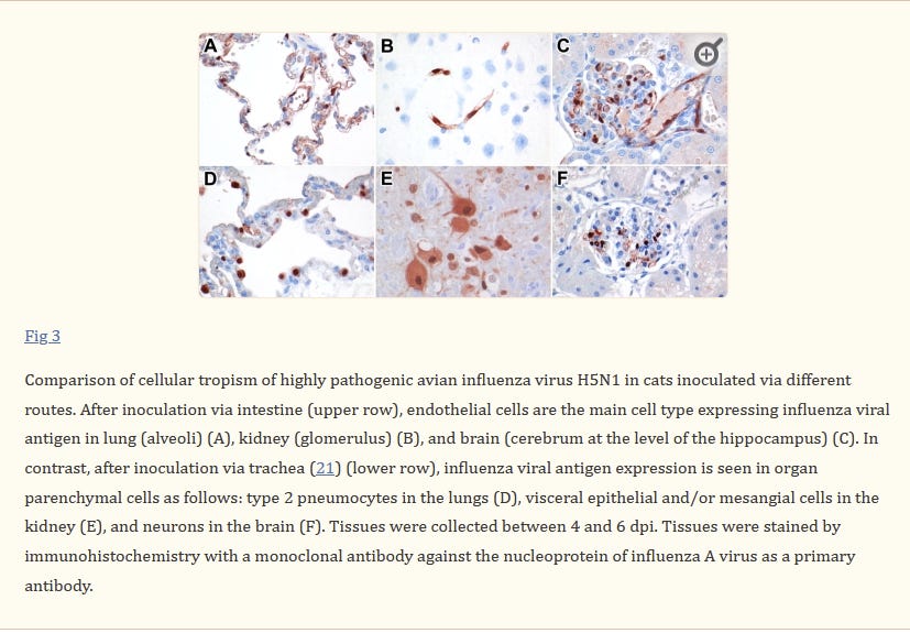 Since the tropism (which “road” and which organs a virus/pathogen prefers) of the current avian flu is somewhat uncharacteristic, it is the one I was most eager to read about.