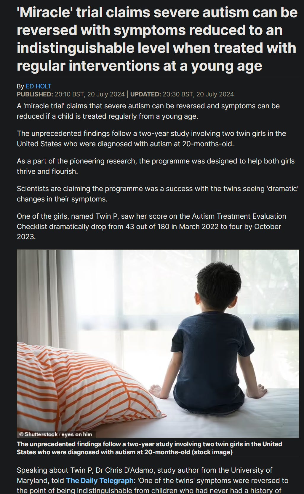 The paper has many details, but the first one that I would like to bring to attention is how unique Autism, is to the barebones of an individual level. These are sisters, and twins, and even with this similarity in genetics, they had distinctive aspects to each one. They were diagnosed with Level 3 ASD, the “most severe” form usually requiring substantial and significant support, and the reversal took 2 years of very extensive and complex work.