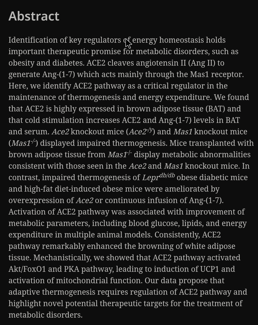 ACE2 pathway regulates thermogenesis and energy metabolism