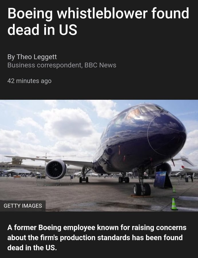 This next one is the actual conspiracy part, this one will be part of a bigger article in my other publication, but it is entirely interesting on its own. A Boeing whistleblower who brought to attention all the severely massive problems the company was facing with its planes, safety, engineering, etc. Well, he was “suicided”.
