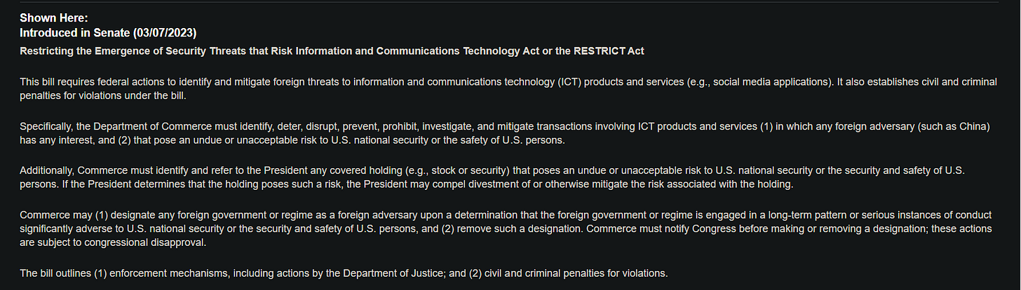 The proposed Restrict Act was DOA (Dead on Arrival) because of how bad the bill was, probably too politically hot to even contemplate openly discussing the bill, Restrict basically gave the government power to access any device you own that connects to the internet.