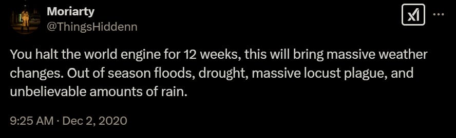 First, we need Chrono’s help to rewind time and go back to 2020. As much and well-deserved bad reputation pollution gets, over the decades our beautiful planet as one of the most complex self-adaptable systems in the universe, acclimated to the presence of specific microparticles in our atmosphere. Climate change is a cult, but the contribution of pollution to weather patterns is real, it isn’t just catastrophic, just the world being the world.